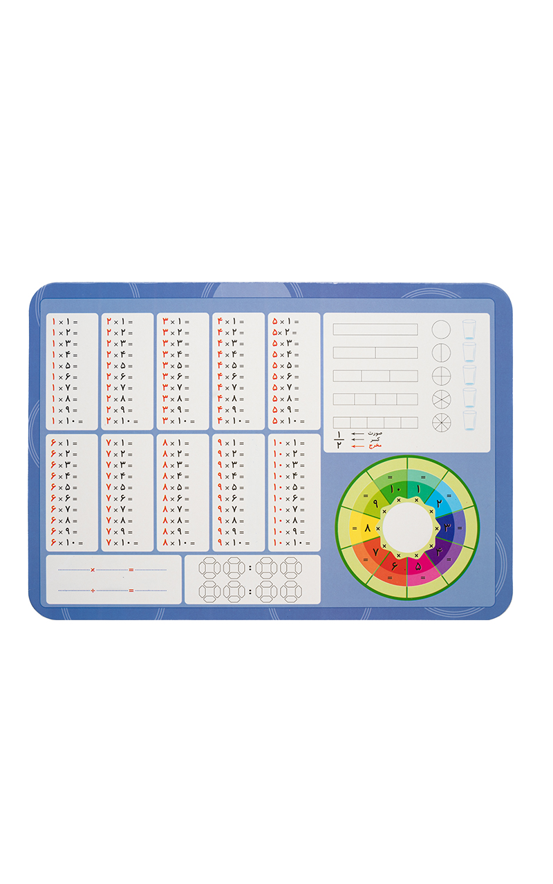 یک تخته وایتبورد آموزشی هست که روی اون تقریباً تمامی جداول و الگوهایی که برای دانشآموزان کلاس سوم ابتدایی لازم هست، از جمله یک محور اعداد، جدول اعداد ۱ تا ۱۰۰، جدول ارزش مکانی یکی و دهتایی، تساوی جمع و تفریق و تصویر یک ساعت بدون عقربه و دارای ارقام ساعتشمار و دقیقهشمار برای آموزش ساعت وجود داره.با استفاده از این تخته، تجربه تمرین ریاضی به یک تجربه شیرین تبدیل میشه. در گوشهی تخته جایی هم برای ثبت نام و نام خانوادگی کودکان در نظر گرفته شده تا کلاس سومی ها مراقب تختهی خودشون باشن.